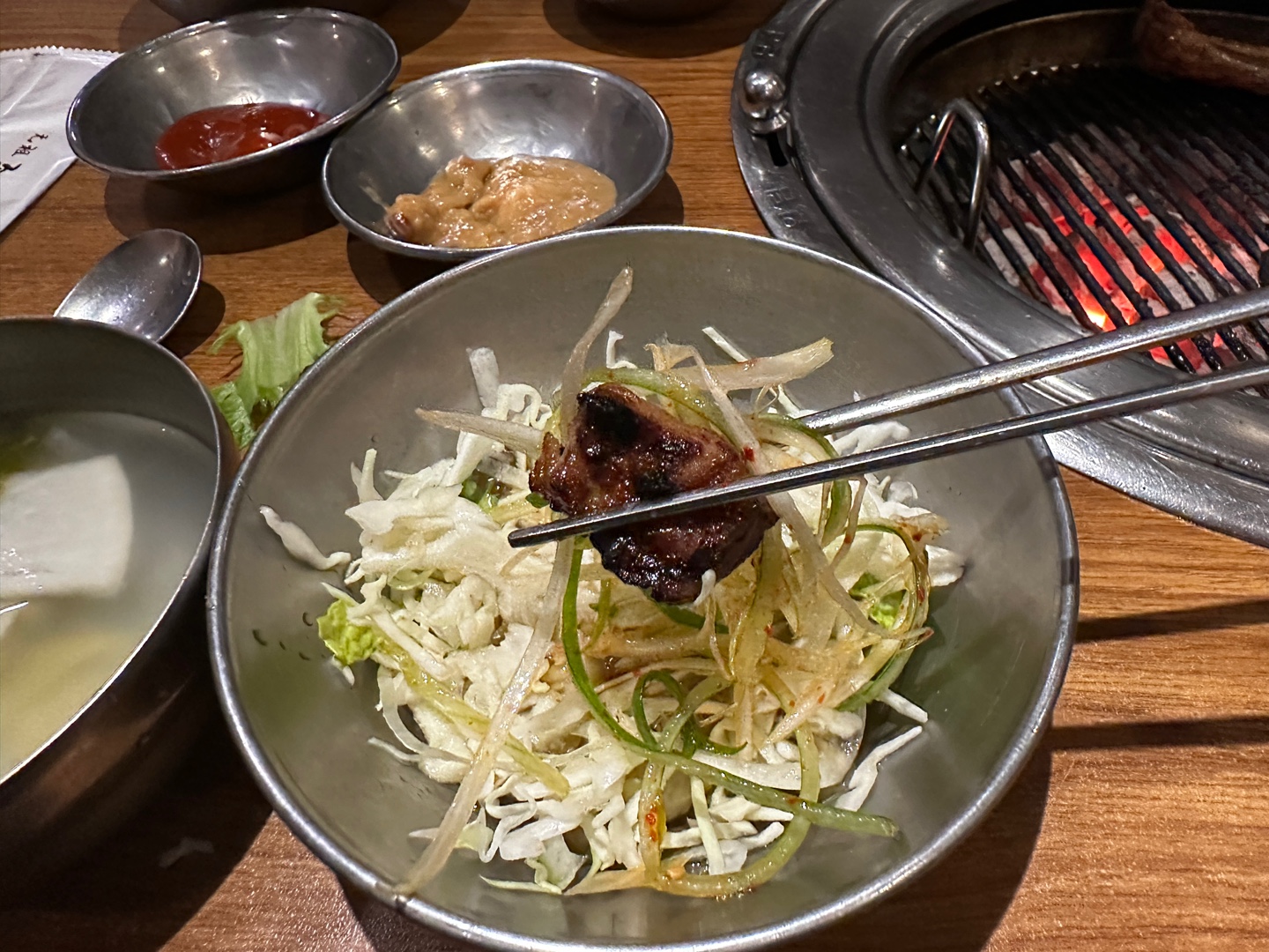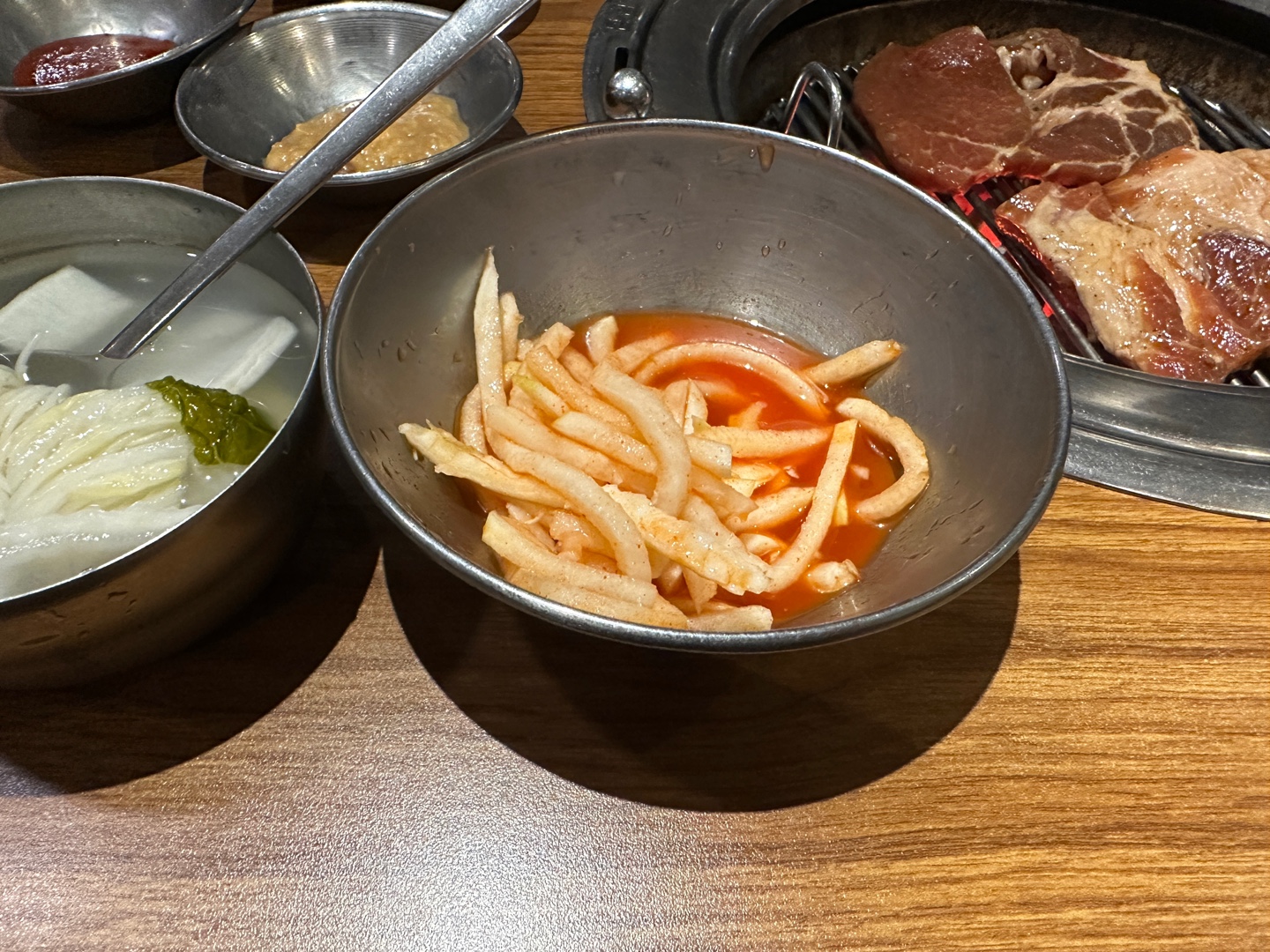 양념이 과하지 않은데 은은하게 단맛이 잘 느껴지고, 돼지고기의 기름진 부위와 잘 어울립니다.