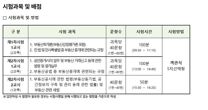 2차시험 1교시: 중개사법/ 공법- 과목당 40문항- 시험시간 총 100분- 5지선다