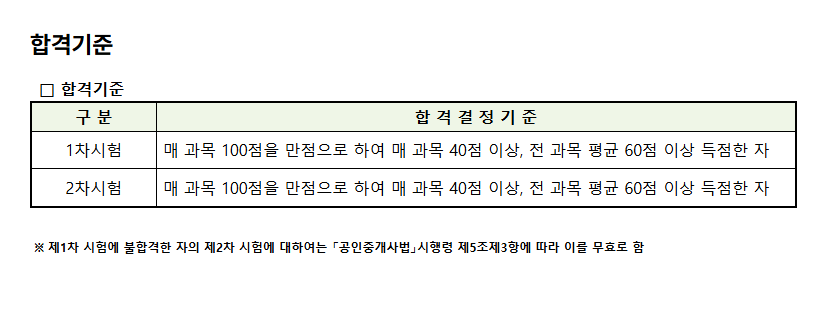 합격기준은 매 과목 100점 만점 중 40점 이상, 전과목 평균 60점 이상 득점해야 합격입니다.